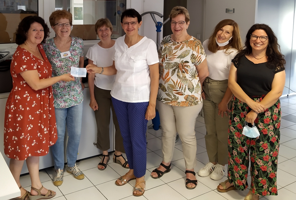 Catherine Faner, Présidente d’1, 2, 3 Soleil, accompagnée de trois bénévoles ont remis un chèque de 1200 € le 02/07/2021 à Mme Ucciani, Directrice du SESSAD St-Thys.